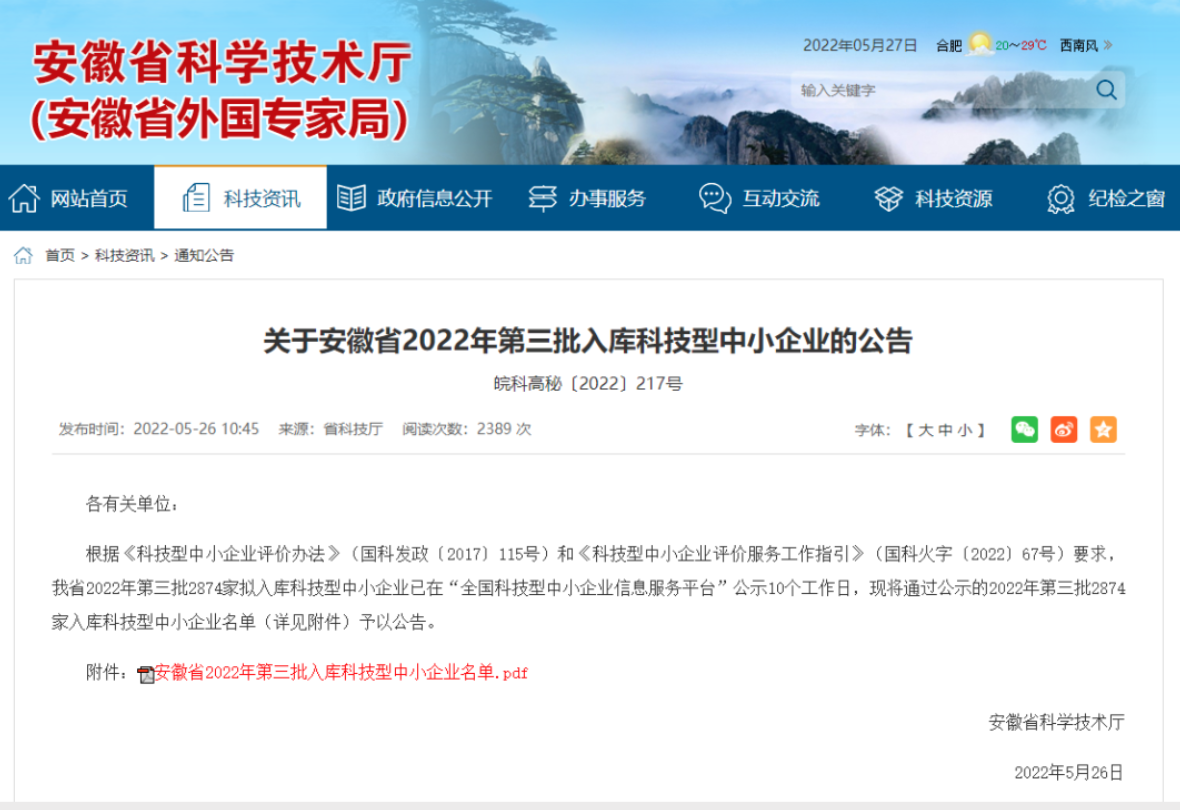 5月26日,安徽省科技廳公示了2022年第三批擬入庫(kù)科技型中小企業(yè)名單,園區(qū)安徽海萃工業(yè)制劑有限公司和安徽軒架網(wǎng)絡(luò)科技有限公司兩戶企業(yè)成功入庫(kù)。